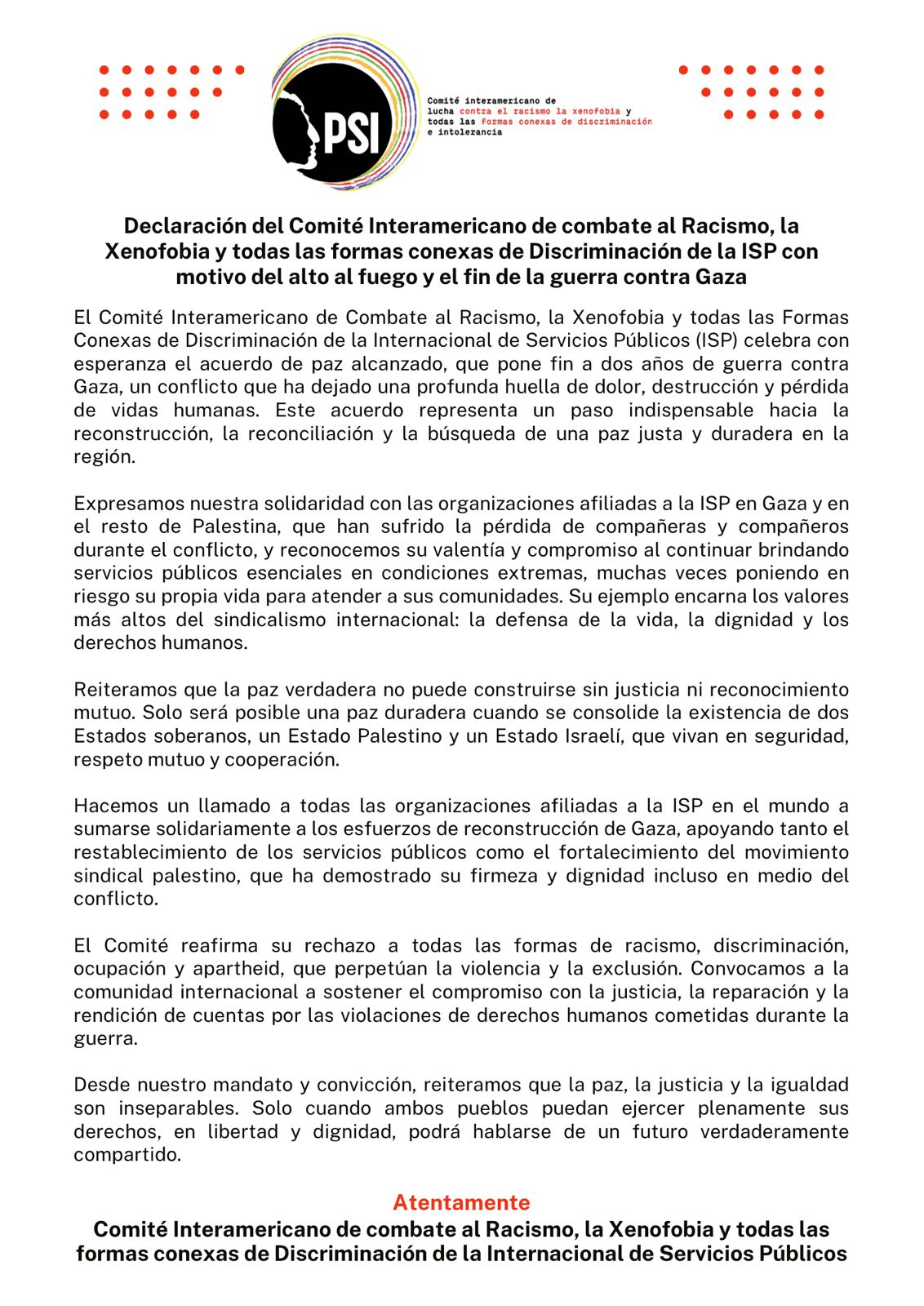 Declaração do Comitê Interamericano de Combate ao Racismo, à Xenofobia e a Todas as Formas Correlatas de Discriminação da ISP por ocasião do cessar-fogo e do fim da guerra contra Gaza